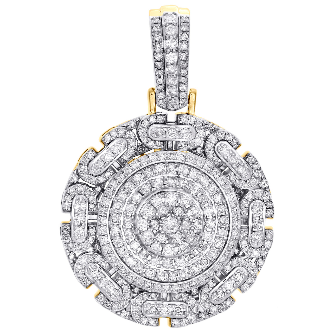 (17.2 gr. of 10K Yellow Gold | Total Carat Weight: 3.15 ct. t.w. of White Diamonds | Length: 1.95" (including bail) | Width: 1.30" | Clarity: SI2 - I1 | Color: G - H | Mens Round Cut Genuine Diamond Byzantine Link Circle Statement Pendant Charm)