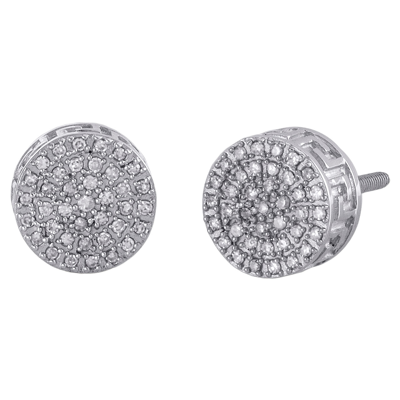 10K White Gold Round Diamond Cluster Circle 3D Studs Greek Key Earrings 0.15 CT.