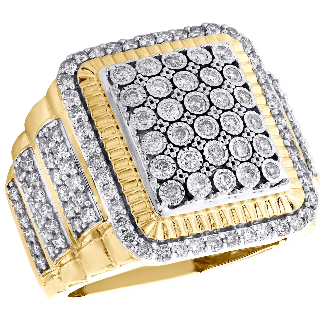 A bold and manly look, this sparkling diamond ring is just the perfect style for him. This versatile ring is brilliantly crafted in solid 10K Yellow Gold. This ring features cluster of sparkling genuine round diamonds set in 22mm frame. This ring design was intricately thought out so it can worn for any occasion, no matter how casual or fancy. Frame of diamonds, with border Fluted Square Shape design in gold has a masculine look. Make an impression with this exclusive bold fashion statement ring. Radiant with 2 ct. t.w of genuine white round diamonds, this ring is high-polished to a lustrous shine. Solid gold ring weighs approx. 11.2 grams. All diamonds are 100% genuine and matched to perfection throughout. The diamonds are securely held in pave / miracle setting, making the overall appearance larger and lustrous. Available in size 10, can be sized upon request for additional charge.