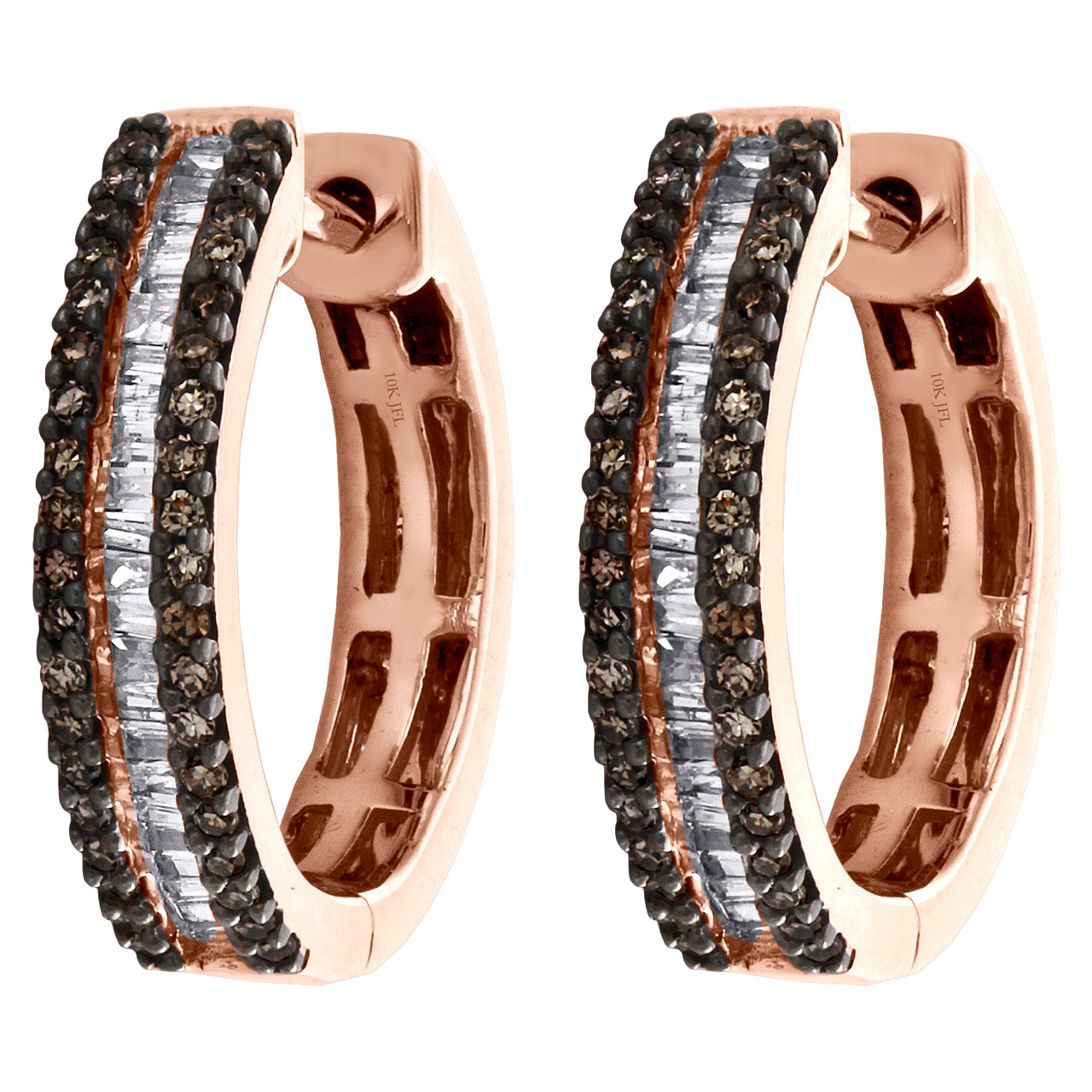 Color, sparkle and style combine to form these amazing Diamond Hoop / Huggie Earrings. Casted in precious 10K Rose Gold, these hoop earrings feature Round and Baguette Cut, shimmering White and Brown Diamonds. Perfect for any-time wear, these earrings captivate with 1/2 ct. t.w. of genuine diamonds. Polished to a bright shine, all round cut diamonds are in Invisible and Prong Setting, making the overall appearance larger and lustrous. These earrings secure comfortably with Snap / Hinged Closure backing for secure wear. These diamond hoops are an elegant choice anytime and will make a great addition to your jewelry collection with this classic piece.
