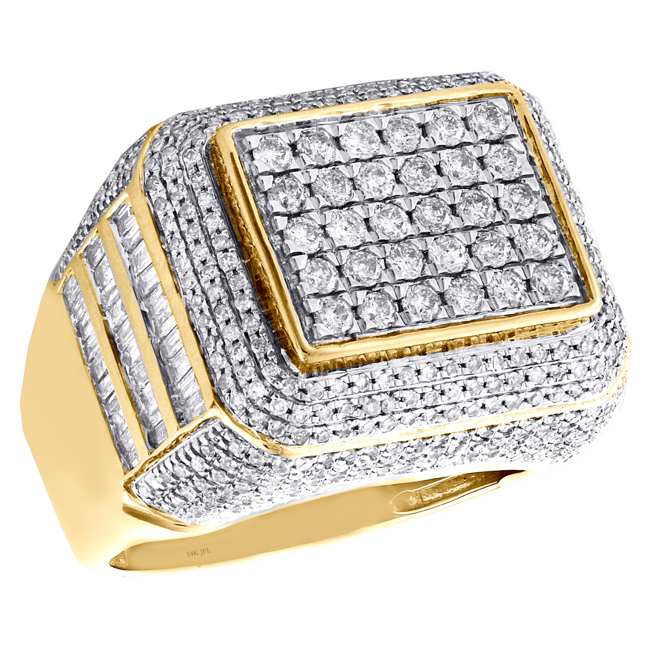 A bold and manly look, this sparkling diamond ring is just the perfect style for him. Brilliantly casted in 14K Yellow Gold, this ring features sparkling round and baguette diamonds set in 18mm wide frame. This ring design was intricately thought out so it can be worn for any occasion, no matter how casual or fancy. Step Tiered Square Frame with round diamonds is the focal point of this fancy statement band, making a bold fashion statement. Make an impression with this exclusive ring captivating 2 ct. t.w. of genuine Round and Baguette cut diamonds, with high polished to a lustrous shine. This ring is caged back for comfort fit and weighs approx. 13.3 gr. All diamonds are 100% full cut natural / genuine and are matched to perfection. The diamonds are Invisible and Prong set, making the overall appearance larger and lustrous. Available in size 10. If a different size is needed, please send us a message, sizing charges apply.