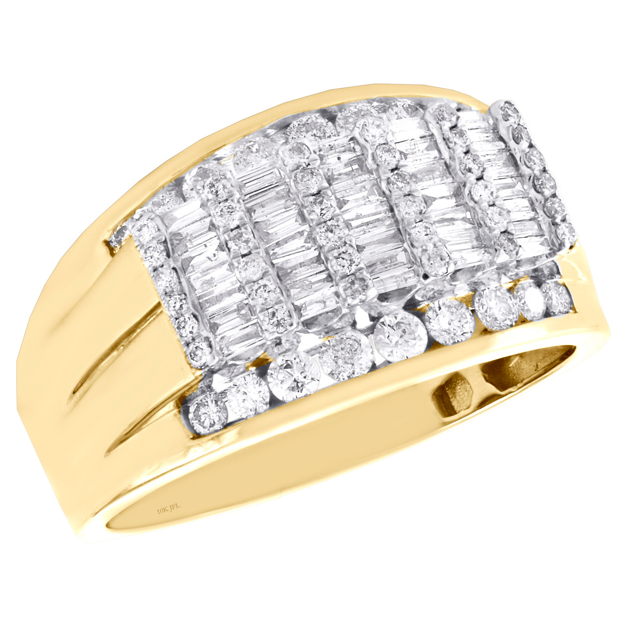 (5.6 gr. of 10K Yellow Gold | Total Carat Weight: 1 ct. t.w. of White Diamonds | Width: 12mm | Clarity: SI2 - I1 | Color: H - I | Men's Round and Baguette Diamond Cluster Wedding Band Wide Statement Pinky Ring)