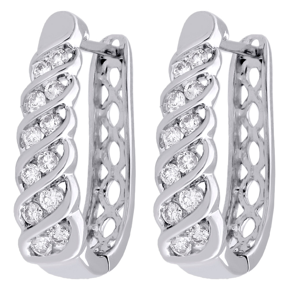 Color, sparkle and style combine to form these amazing huggie earrings. Crafted in precious 10K White Gold, these earrings have a braided & twisted design with channel set round diamonds in each row. Perfect for any-time wear, these earrings sparkle with 0.50 ct. total weight of genuine round diamonds. Polished to a bright shine these genuine diamonds are held in pave setting close together to give a lot of shine. These hoop earrings secure comfortably with snap / hinged closure backing. These diamond hoop earrings are an elegant choice anytime.