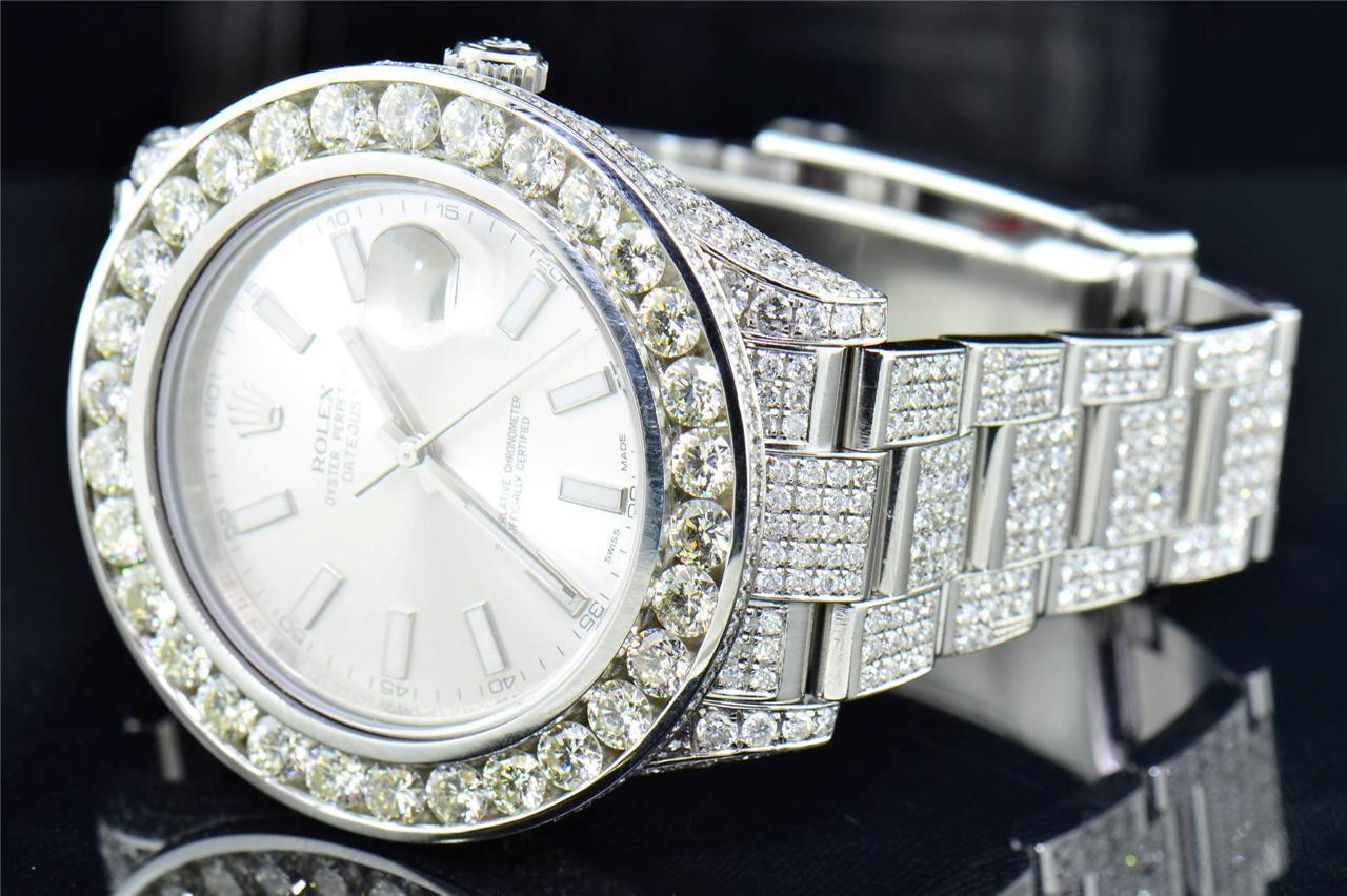 This is a brand new Rolex Date Just Diamond Watch. Comes with all the box & paper work. This Rolex diamond watch features large full round cut diamonds set in the exclusive bezel. This watch is completely in a total of 30 ct. t.w. throughout the whole watch. Each stone is at-least 30 pointers each (0.30 ct./each). Handset diamonds in this bezel is exclusively done by a masterful jeweler that has experience in setting stones on high end brand name watches. The ivory dial on this Rolex watch give this a very very classy look. This watch has the original Rolex band, we just set the diamonds on the band. Links can be adjusted to wrist size.