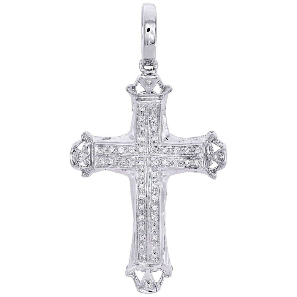 10K White Gold Genuine Diamond Dome Cross Pendant 1.80" Mens Pave Charm 0.17 CT.