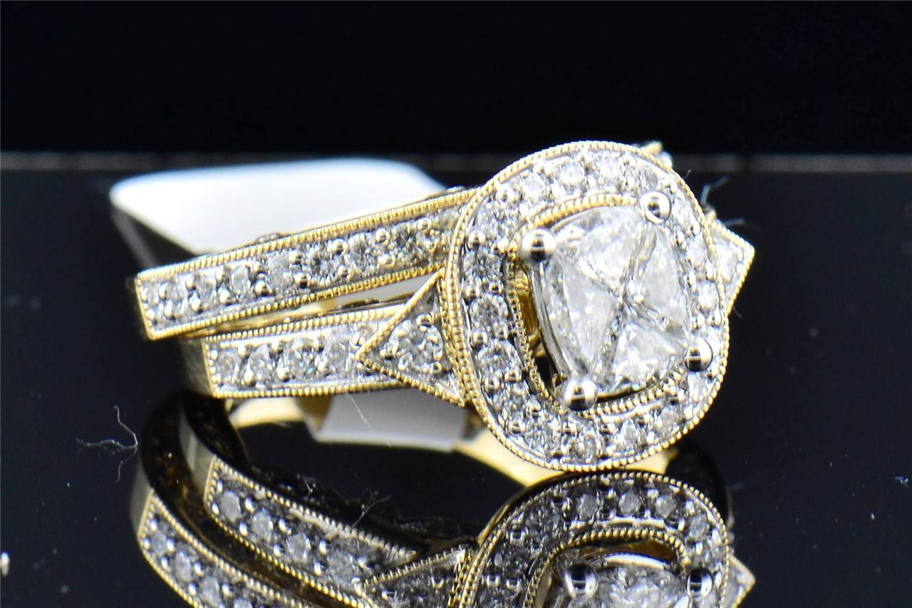 - Ladies 14K Yellow Gold Pie Cut Cushion Halo Diamond Engagement Ring Bridal Set
