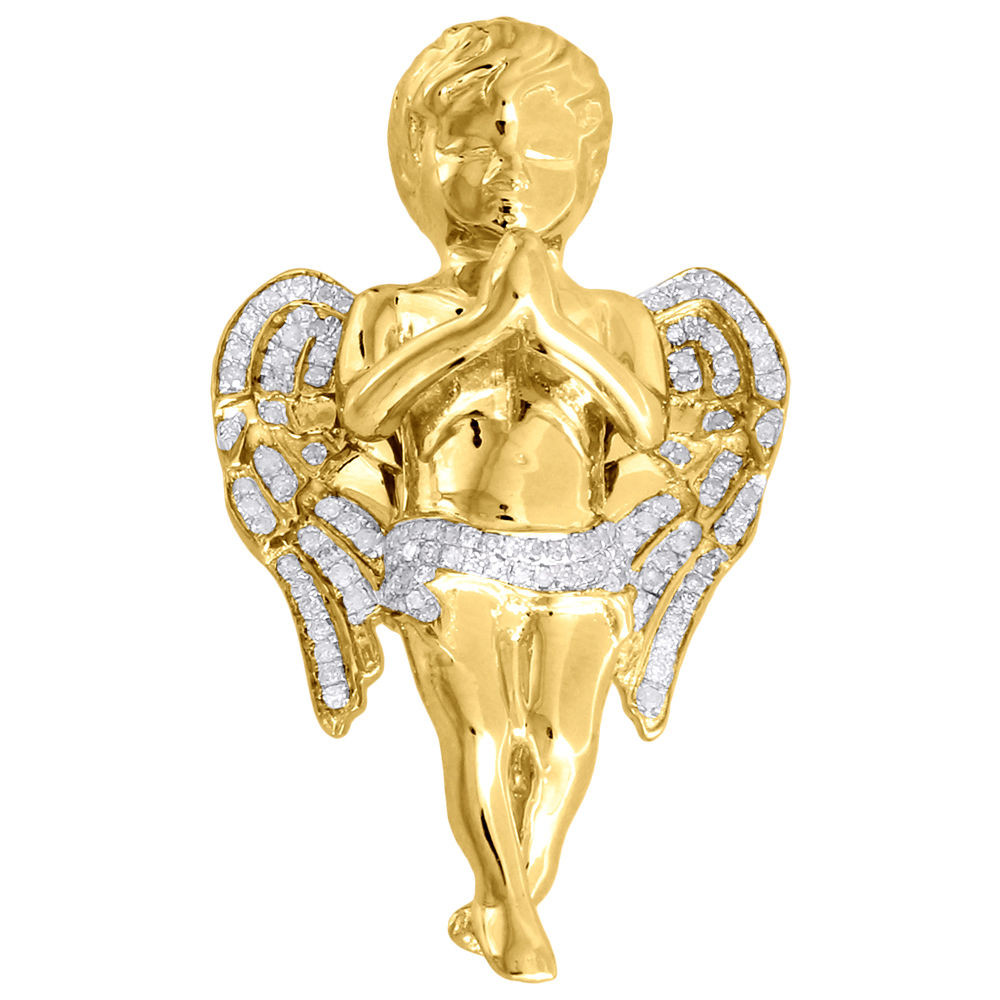 - Diamond Praying Angel Piece Pendant 10K Yellow Gold Round 2 Inch Charm 0.90 Ct.