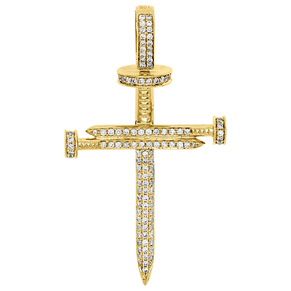 Exclusive new style cross design pendant brought to you by Rodeo Jewelers designers. Crafted in real 10k Yellow Gold with real genuine white diamonds, this pendant features a Nails forming a Cross. Each stone is full cut round diamond in pave setting. The diamonds are very close to each other for an brilliant shine. Radiant with 1.05 Ct. total weight of diamonds, this pendant has a very clean finish. To make it all flow together, the bail has matching diamonds, making this pendant 2.25" Inches long. This pendant is caged back for extra support and durability Solid frame with 9.3 grams of real gold. All the diamonds are of equivalent color and clarity, giving this pendant a comparable shine and luster throughout. We have many different style real 10k gold chains to pair this pendant with. For any questions or queries message us via ebay or give us a call.