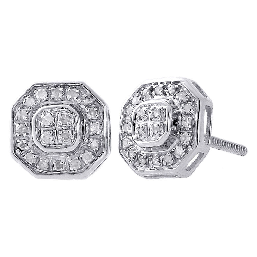- 10K White Gold Diamond Mens Ladies Octagon Shaped Stud 8mm Pave Earrings 0.15 Ct