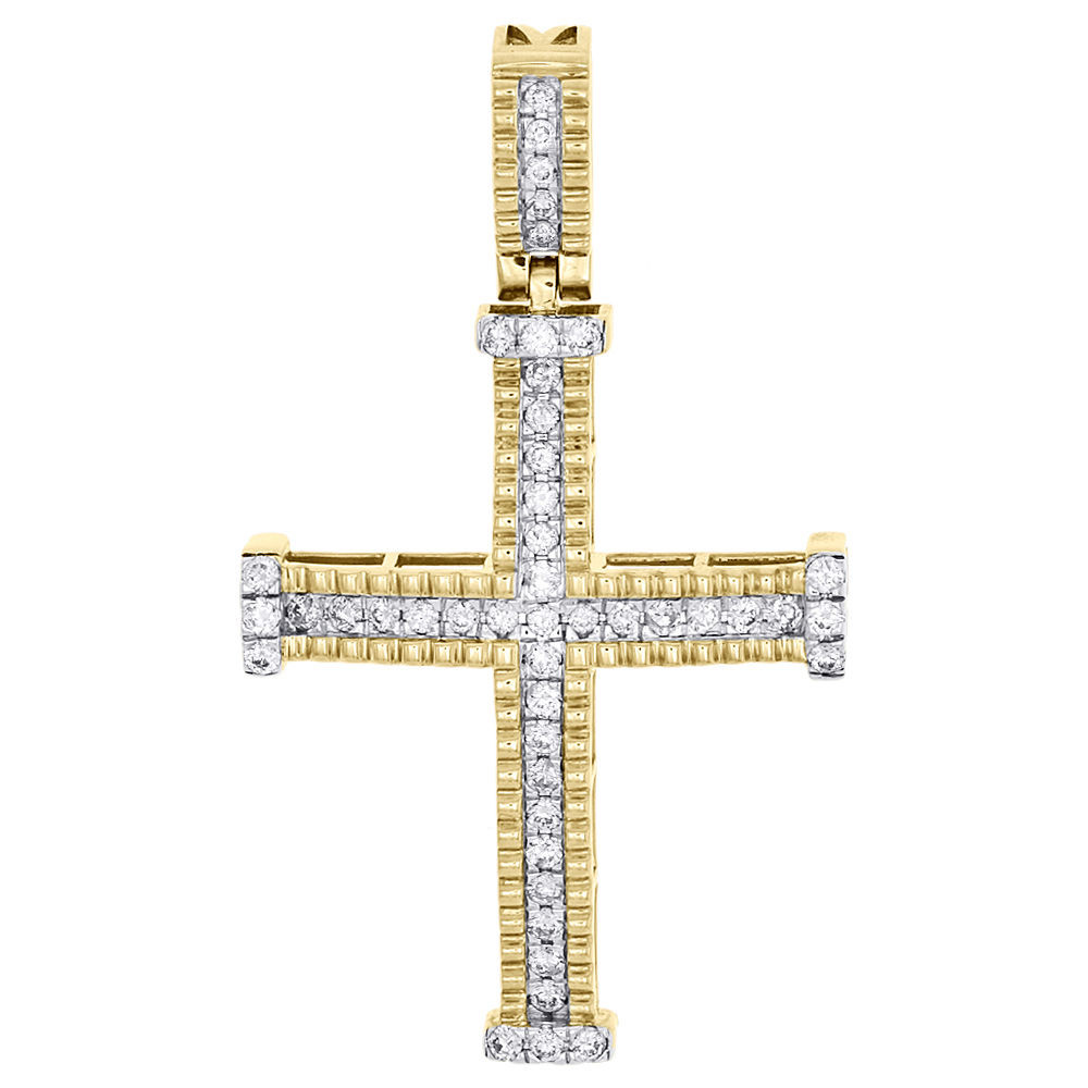 This eye-catching Fluted Bezel Edge diamond cross pendant is crafted in 10K yellow gold & shimmering white diamonds, ensuring sparkle from every angle. Radiant with 1 ct. t.w. of genuine diamonds, this pendant is buffed to a polished luster. Creative yet simple design has a well-built frame with cage to withstand everyday wear and tear. The diamonds are securely held between the gold mounting in a pave setting close together, making the overall appearance larger and lustrous. White diamond studded bail to complete the look. These are all 100% genuine brilliant round diamonds. All the diamonds are of same clarity and color throughout. Great size unisex pendant. This pendant is 8 gr. and 2" in length.