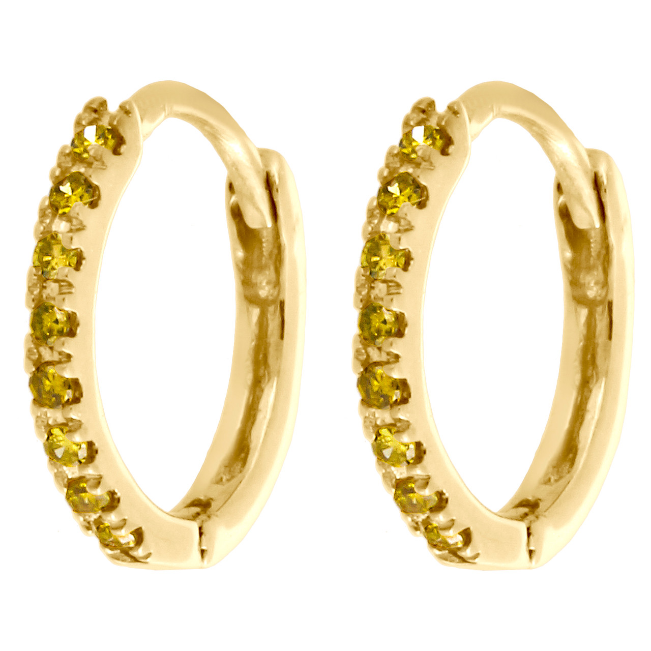 Color, sparkle and style combine to form these amazing hoop earrings. Crafted in precious 10K yellow gold, these mini hoop earrings feature 1 row of shimmering yellow diamonds. Perfect for any-time wear, these earrings sparkle with 1/8 ct. t.w. of genuine round diamonds. Polished to a bright shine these genuine diamonds are held in prong setting close together to give a lot of shine. These hoop earrings secure comfortably with snap / hinged closure backing. These diamond hoop earrings are an elegant choice anytime.
