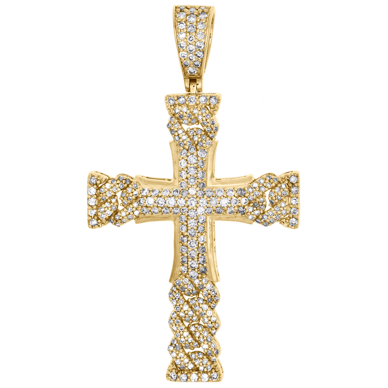 This eye-catching diamond Miami Cuban Link Cross Pendant is crafted in solid 10K Yellow Gold and shimmering white diamonds, ensuring sparkle from every angle. Radiant with 1.18 ct. t.w. of genuine diamonds, this pendant is polished to a lustrous shine. Exclusive style has a well built frame with caged back to withstand everyday wear and tear. The diamonds are securely held between the gold mounting in a pave setting close together, making the overall appearance larger and lustrous. Fancy diamond bail to match the body of this pendant. These are all 100% genuine round diamonds. All the diamonds are of same clarity and color throughout. Great size pendant is 1.95 inch long and weighs approx. 6.7 grams. This one of a kind piece would make a perfect addition to your jewelry collection.