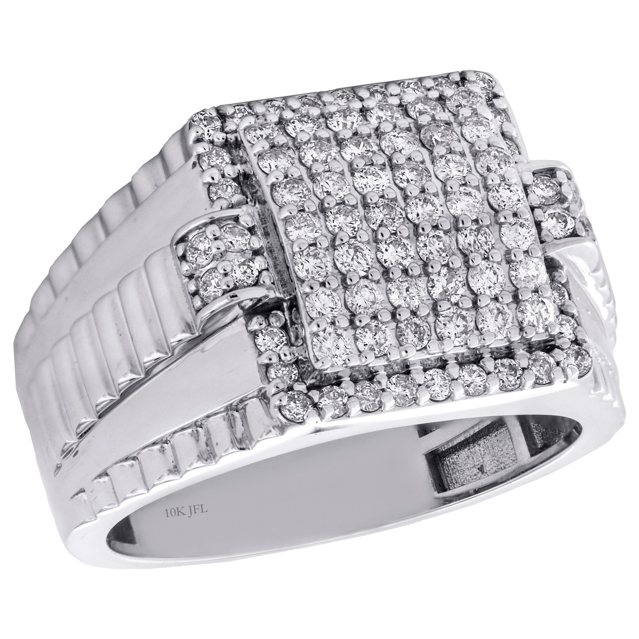 A bold and manly look, this sparkling diamond ring is just the perfect style for him. Brilliantly casted in 10K White Gold, this ring features shimmering round diamonds set in wide 14.50mm frame. This ring design was intricately thought out so it can be worn for any occasion, no matter how casual or fancy. Step Shank tiered sides are the focal point of this fancy statement band making a bold fashion statement. Make an impression with this exclusive ring captivating 1 ct. t.w. of genuine full cut round diamonds, with high polished to a lustrous shine. This ring is caged back for comfort fit and weighs approx. 9.6 gr.. All diamonds are 100% natural and are matched to perfection. The diamonds are securely Pave Set in this gold mounting, making the overall appearance larger and lustrous. Available in size 10. If a different size is needed, please send us a message.