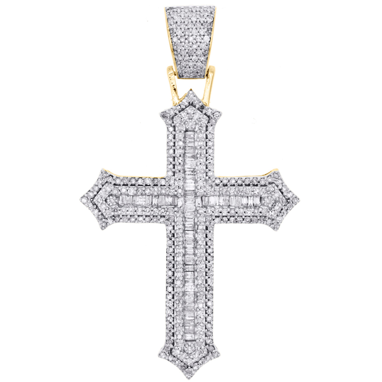 (5.9 gr. of 10K Yellow Gold | Total Carat Weight: 1 ct. t.w. of White Diamonds | Length: 1.90" (including bail) | Width: 1.10" | Thickness: 4mm | Clarity: SI2 - I1 | Color: H - I | Men's Real Round and Baguette Diamond Religious Halo Cross Pendant Tier Statement Charm)