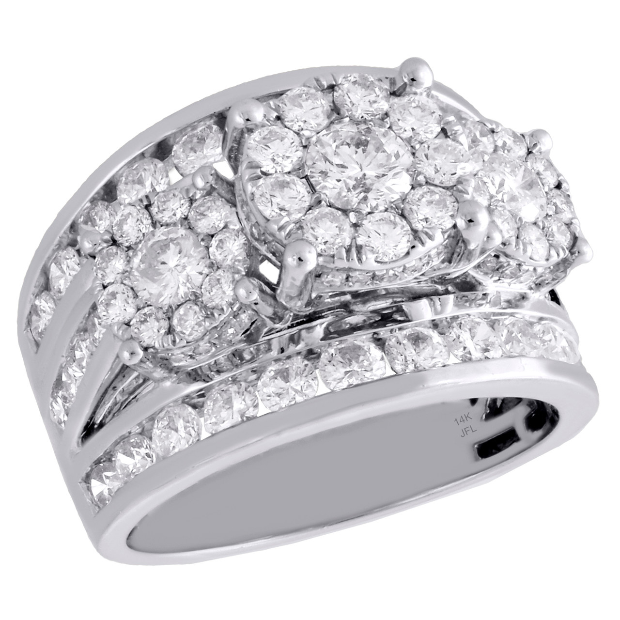 14K White Gold Three Cluster Solitaire Diamond Engagement Ring Flower Set 3 CT.