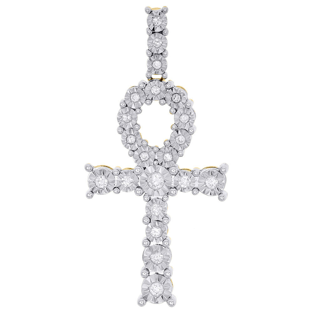 This eye-catching diamond Egyptian Ankh Cross pendant is crafted in 10K yellow gold & shimmering white diamonds, ensuring sparkle from every angle. Radiant with 1/2 ct. t.w. of genuine diamonds, this pendant is buffed to a polished luster. Creative yet simple design has a well-built frame with caged back to withstand everyday wear and tear. Diamond studded bale gives this piece a custom high end look and feel. The diamonds are securely held in a prong setting, at the center of each diamond cut plate, making it the focal point. These are all 100% genuine brilliant round diamonds of same clarity & color throughout. Great size pendant for fashion forward men. This pendant is 6.4 gr. and 1.90" long & would make a perfect gift for all occasions.