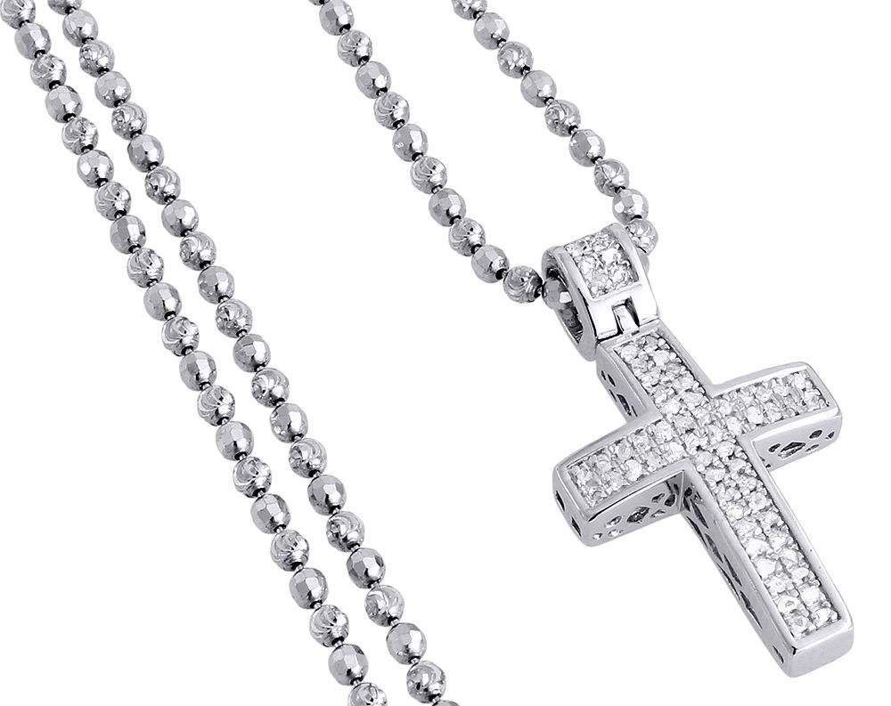 Men's & Ladies Mini Diamond cross set in sold .925 sterling silver metal. It is white polished to give it a real white gold cross look. This is not a big pendant at all. It is a small / mini cross. 2 Rows of Diamonds are set in pave setting. This is a very hot style. It is simple but still makes a statement. It can be given as a gift for any occasion. Chain show in the picture is a 2mm Italian Moon-cut beaded chain. It is White Silver, 24" long with lobster claw clasp. The combination of the chain and the cross gives it a unique and classy look.