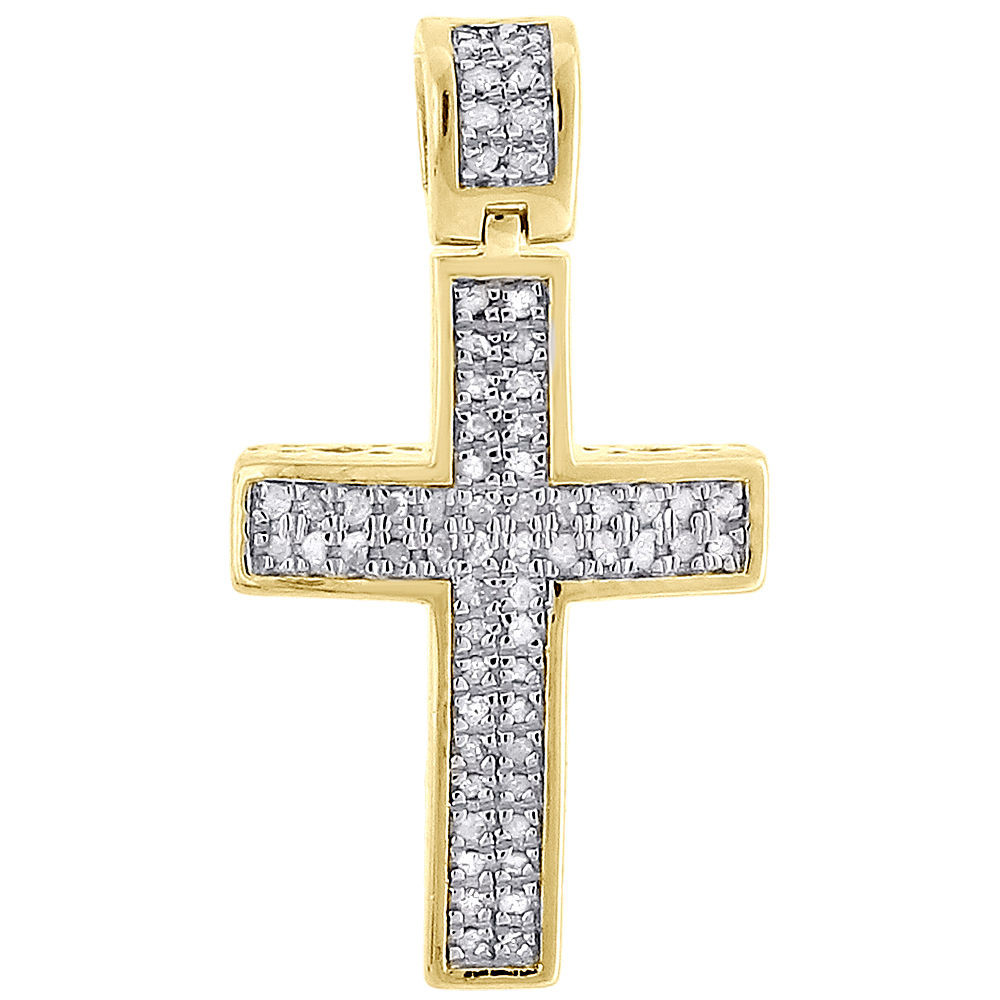 Men's & Ladies Mini Diamond cross set in sold .925 sterling silver metal. It is yellow polished to give it a real yellow gold cross look. This is not a big cross at all. It is a small / mini cross. 2 Rows of Diamonds are set in pave setting. This is a very hot style. It is simple but still makes a huge statement. It can be given as a gift for any occasion.