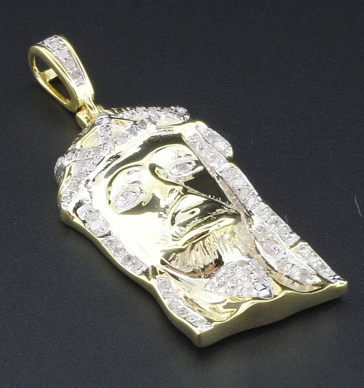 Jewelry For Less brings to you this beautiful Mini Jesus Face Pendant. Set in real .925 Sterling Silver with yellow polishing to give this pendant a real 10K Yellow Gold look for just fraction of the price. The diamonds are round cut and are pave set. This pendant is open back. All the diamonds are matching clarity & color.