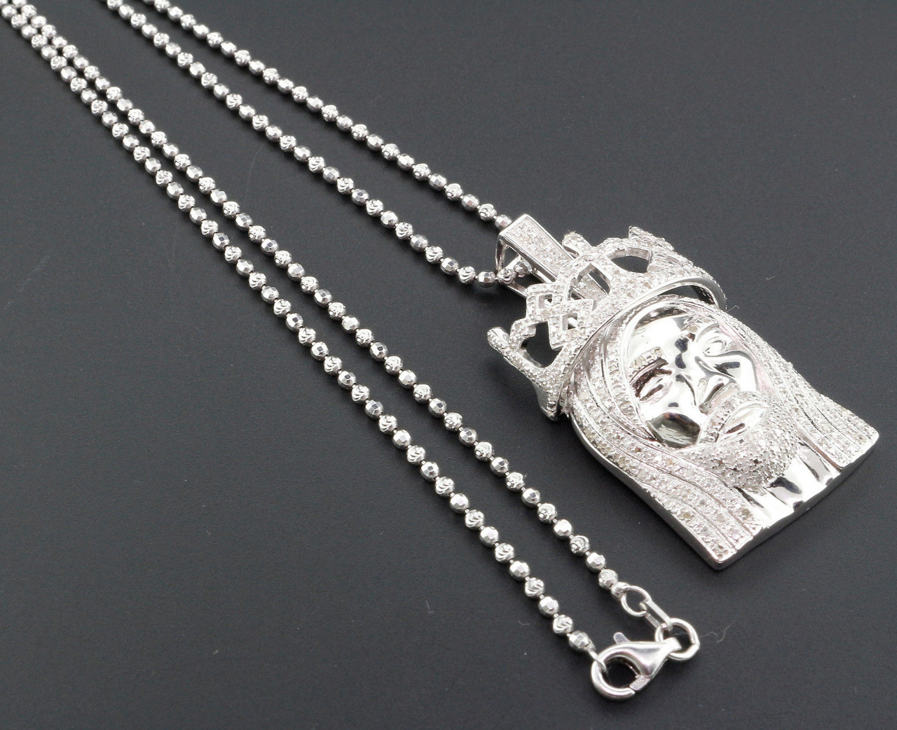 (12.6 grams of Sterling Silver, 1.00 total carats of white diamonds; 1.75" long & 0.96" wide; I1 - I2 Clarity & H - I color; Caged backing; Mini Diamond Jesus Face Pendant Charm; .925 Sterling Silver with white plating; Includes a 2mm Moon-Cut Beaded 24" Chain in .925 Silver.)