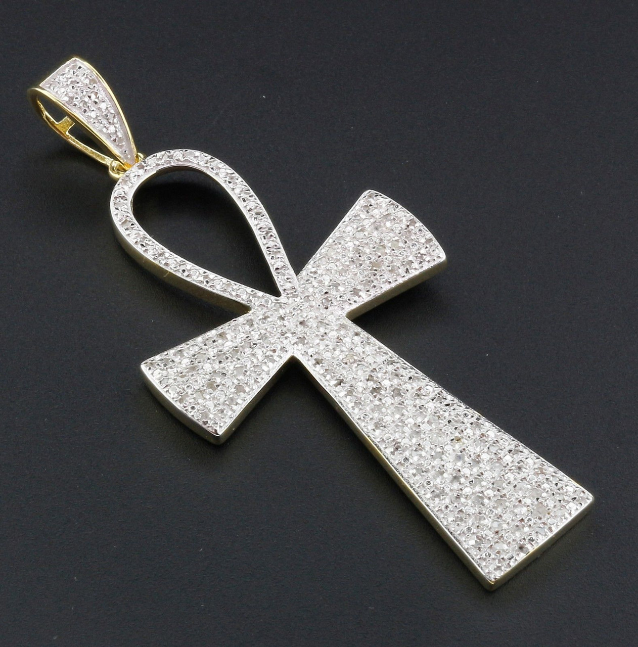 Jewelry For Less brings to you this beautiful Ankh Cross Pendant. Set in real .925 Sterling Silver with yellow polishing to give this pendant a real 10K Yellow Gold look for just fraction of the price. The diamonds are round cut and are pave set. This pendant is open back. All the diamonds are matching clarity & color.