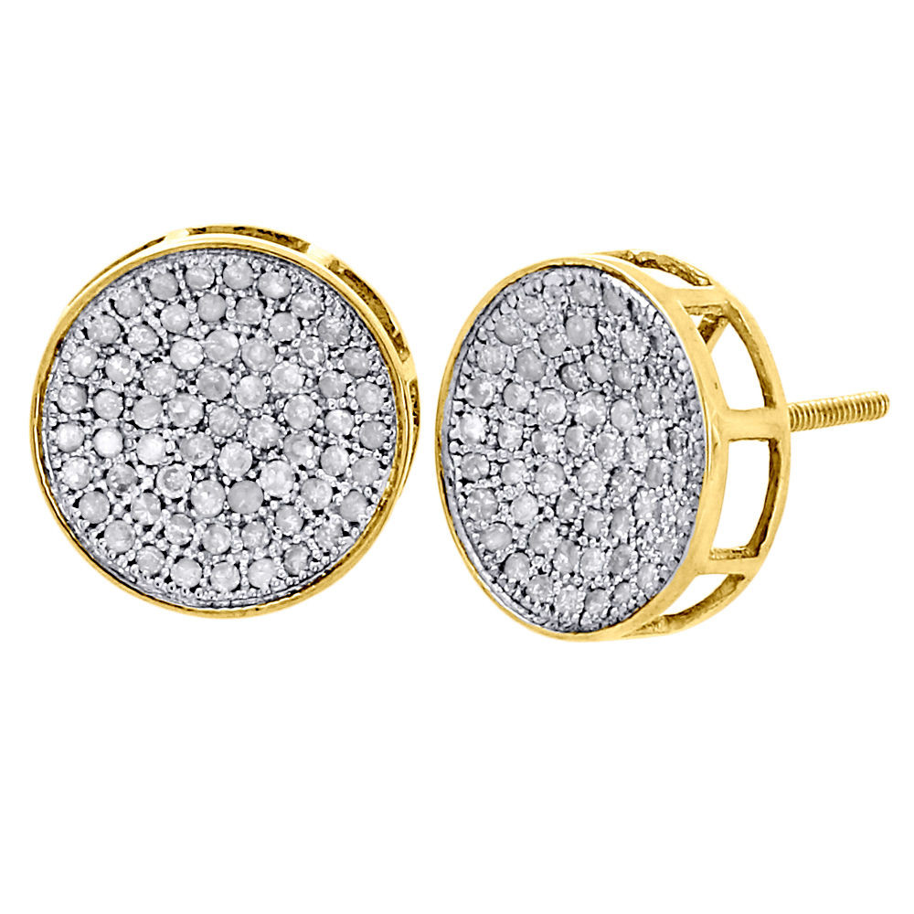 - 10K Yellow Gold Round Diamond Circle Pave Studs Concave 12mm Mens Earrings 1 Ct.