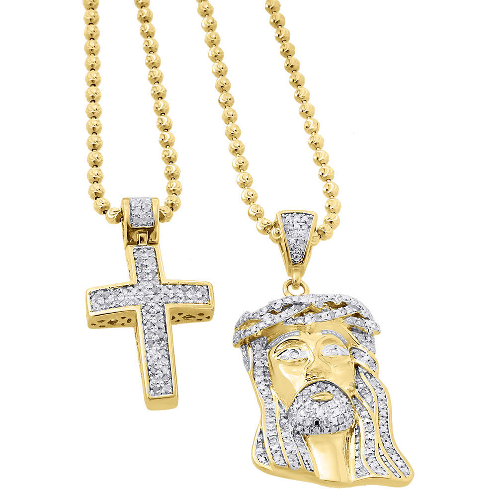 Rodeo Jewelers brings to you this beautiful diamond Cross & Jesus Face Pendant. Set in real .925 Sterling Silver with Yellow Gold Plating with real natural genuine diamonds. Each stone is hand set round diamond, and are set very close to each other for an brilliant shine. Both pendants are caged back for extra support and durability. All the diamonds are matching clarity & color.