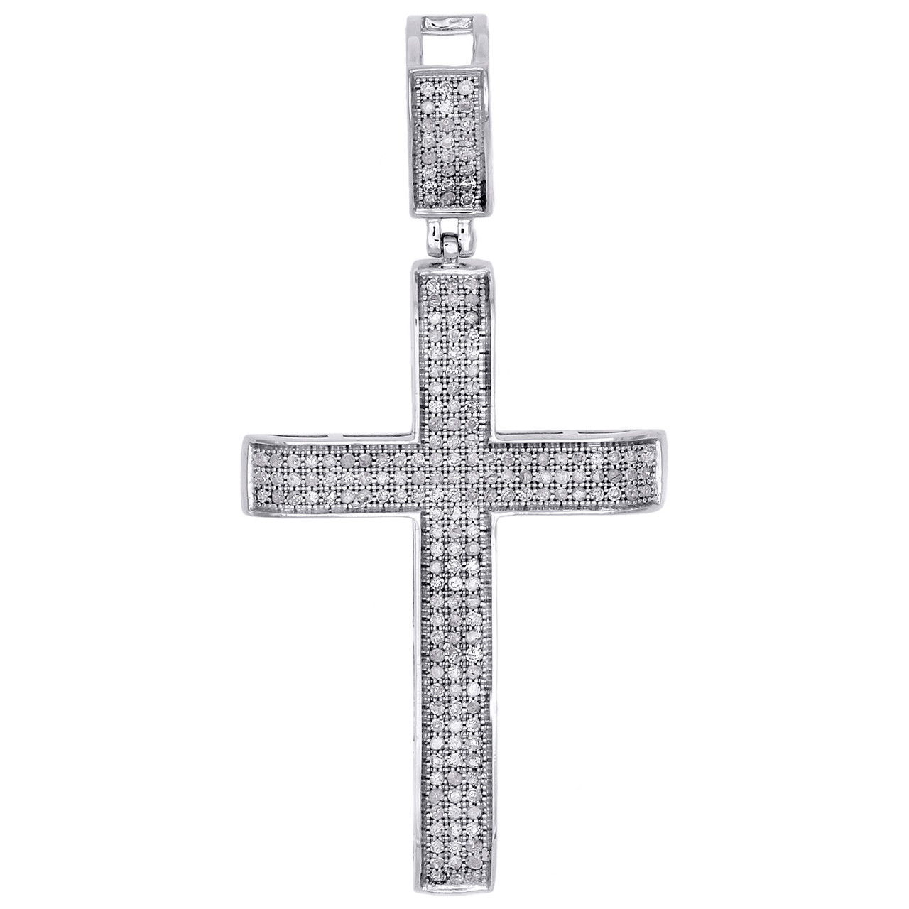 - 10K White Gold Real Round White Diamond Cross Pendant 2" Mens Pave Charm 0.65 CT.