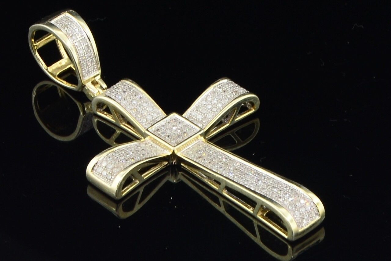 - Diamond Cross Pendant Mens .925 Sterling Silver Ribbon Design Charm 0.95 Tcw.