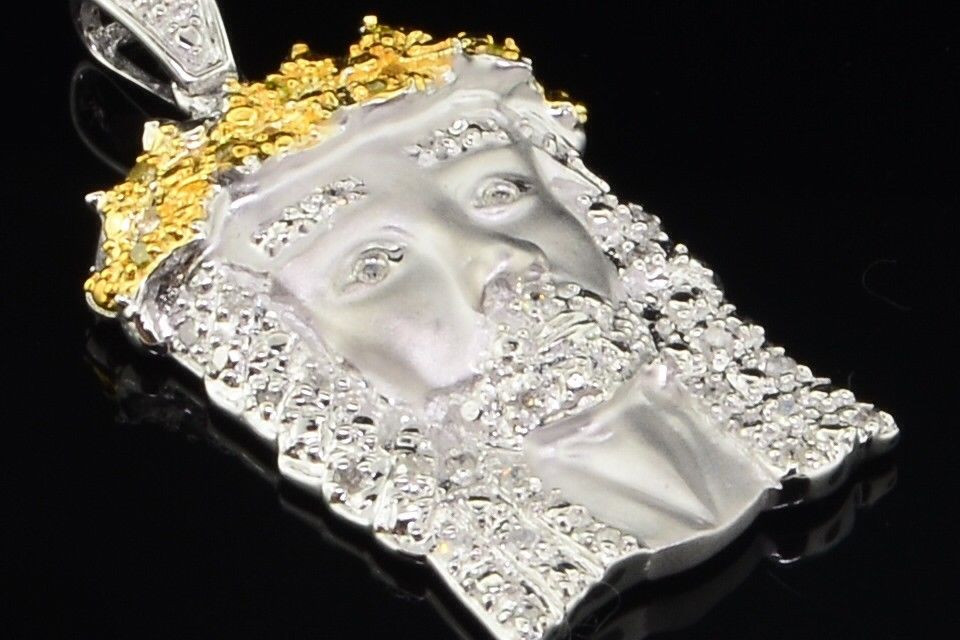 - 10k White Gold White & Yellow Diamond Mini Jesus Piece Head Cross Pendant .50 Ct