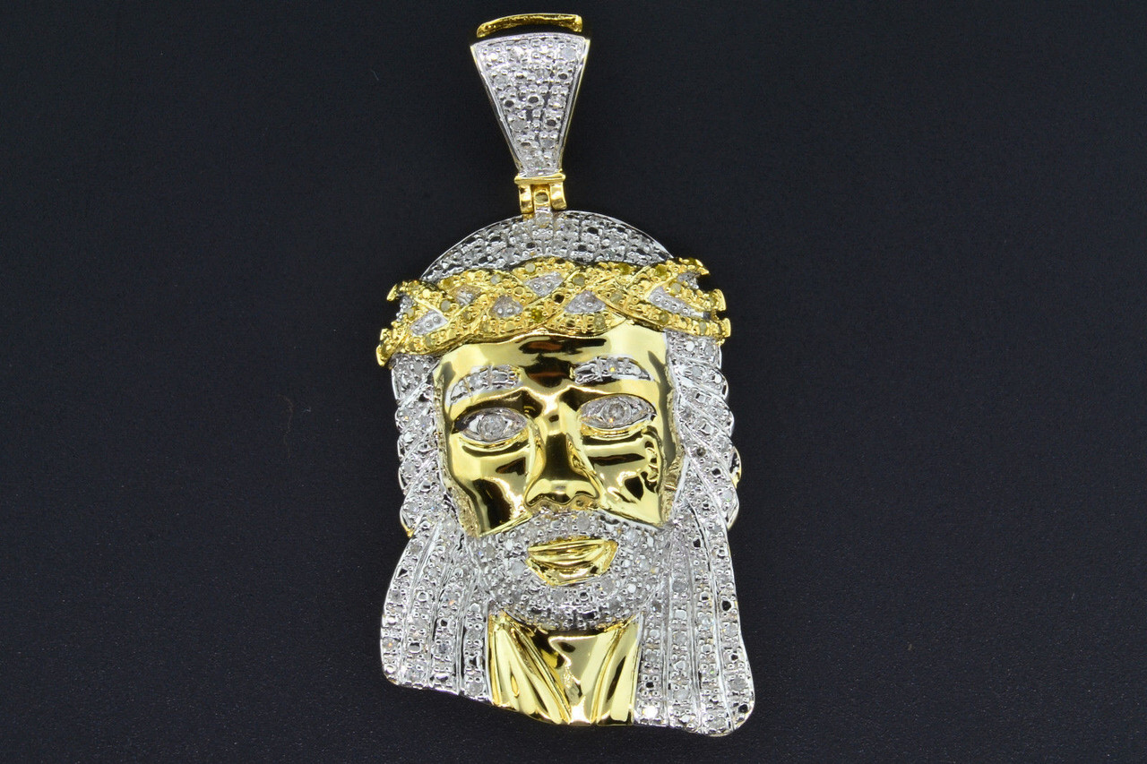 This Jesus Face Pendant is set in real .925 Sterling Silver w/ Yellow Gold Finishing. The White Diamonds are set in Pave & Prong Setting. This makes for a great gift for any occasion.