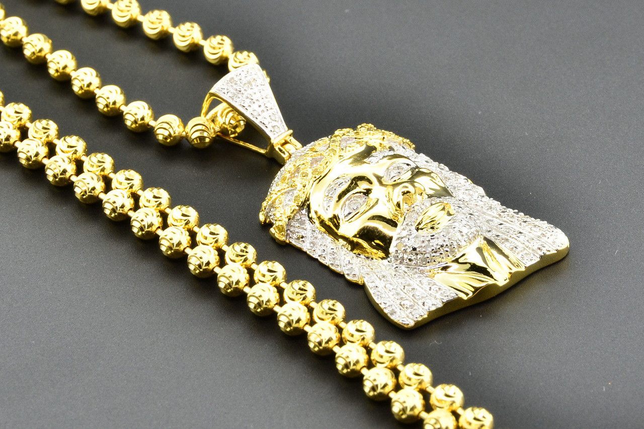 This Jesus Face Pendant is set in real .925 Sterling Silver w/ Yellow Gold Finishing. The White Diamonds are set in Pave & Prong Setting. This makes for a great gift for any occasion.