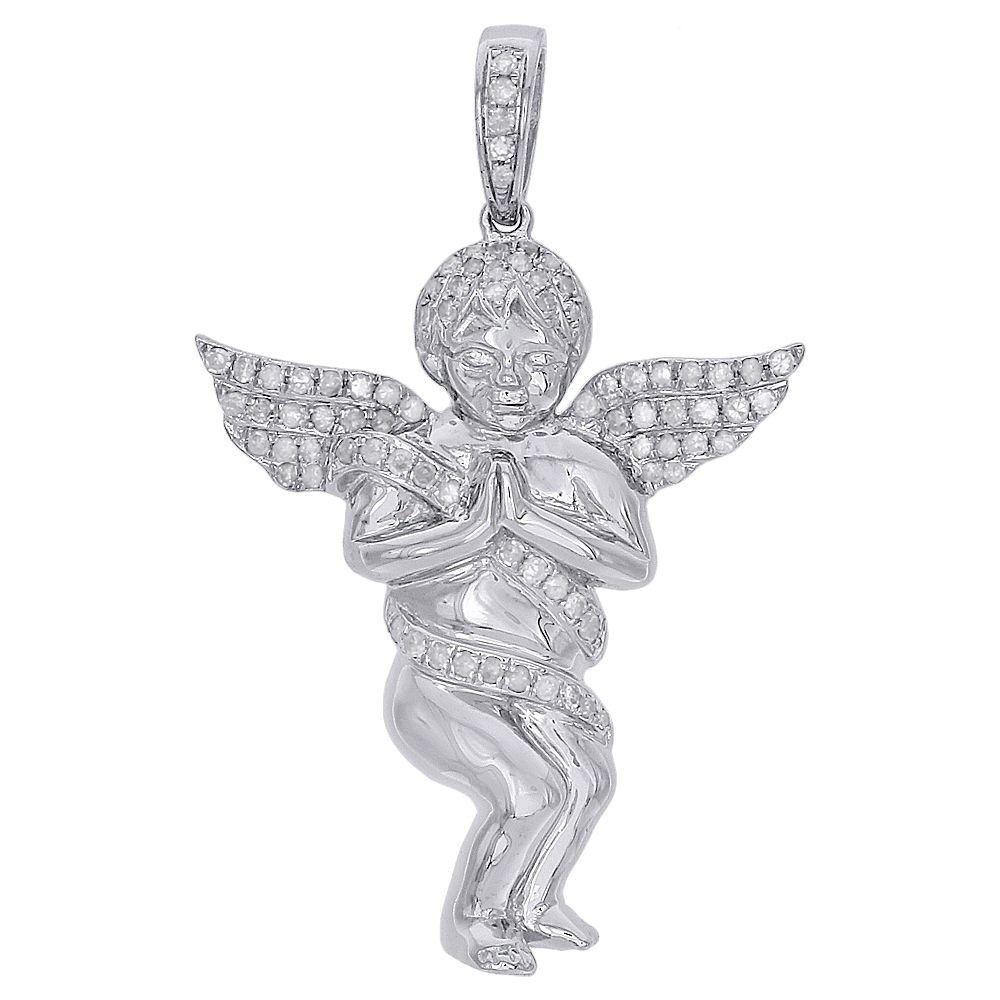 (4.3 grams of 10K White Gold | 0.46 ct. total weight of white diamonds | 1.60" long & 1" wide | I1 - I2 Clarity & H - I Color | Unisex Praying Angel with Wings Diamond Pendant / Pave Charm)