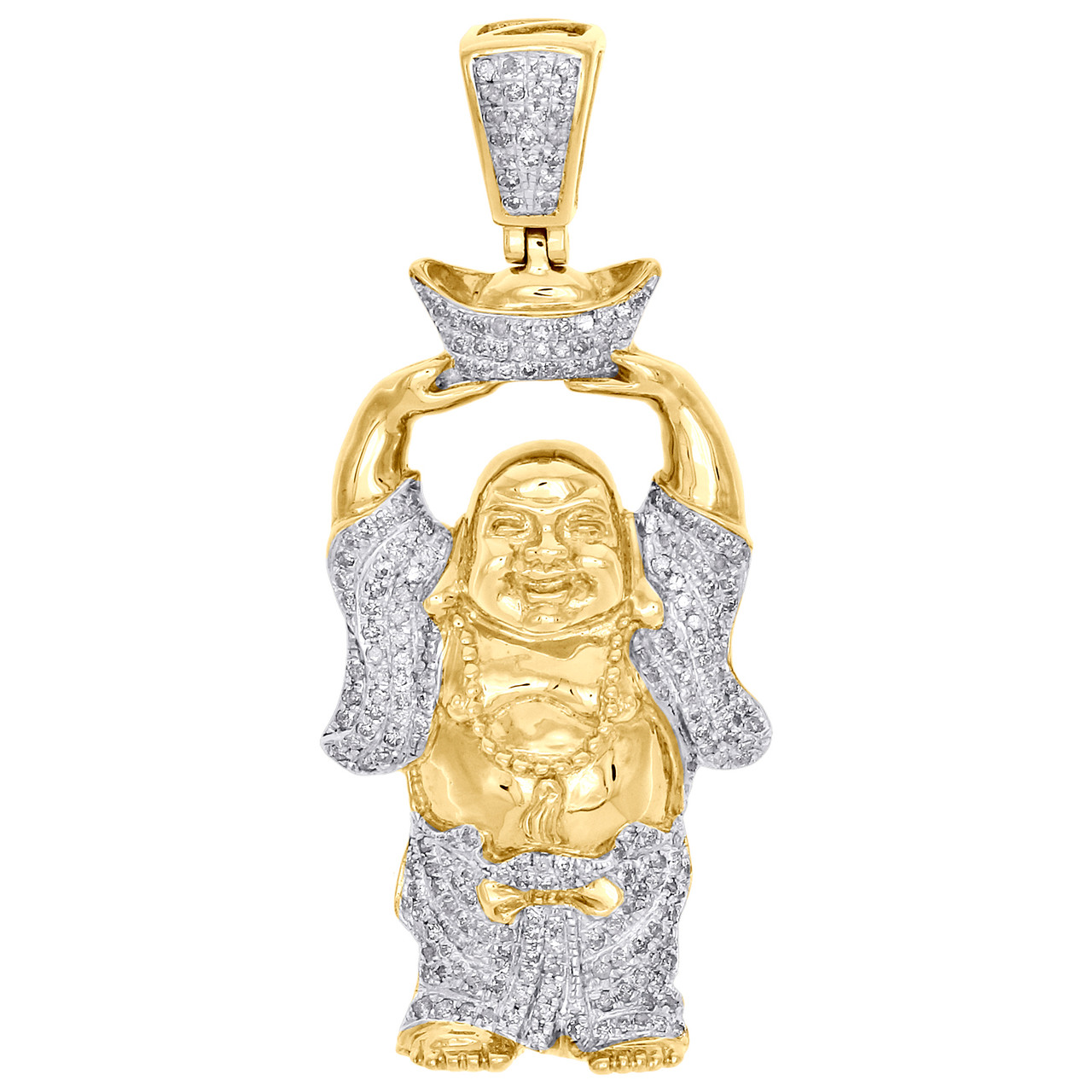 (7.2 gr. 10k Yellow Gold | Total Carat Weight: 0.82 ct. t.w. of White Diamonds | Length: 1.90" (including bail) | Width: 0.80" | Clarity: I1 - I2 | Color: H - I | Men's Genuine Round Diamond Laughing Fat / Bald Buddha Pendant High-polished Pave Setting Charm)