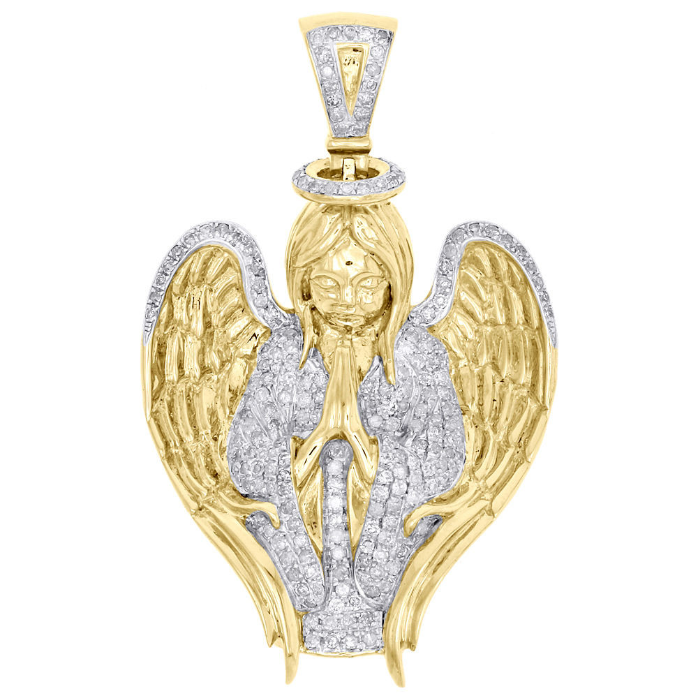 - 10K Yellow Gold Diamond Praying Angel Pendant 1.90" Men's Pave Charm 1.23 CT.