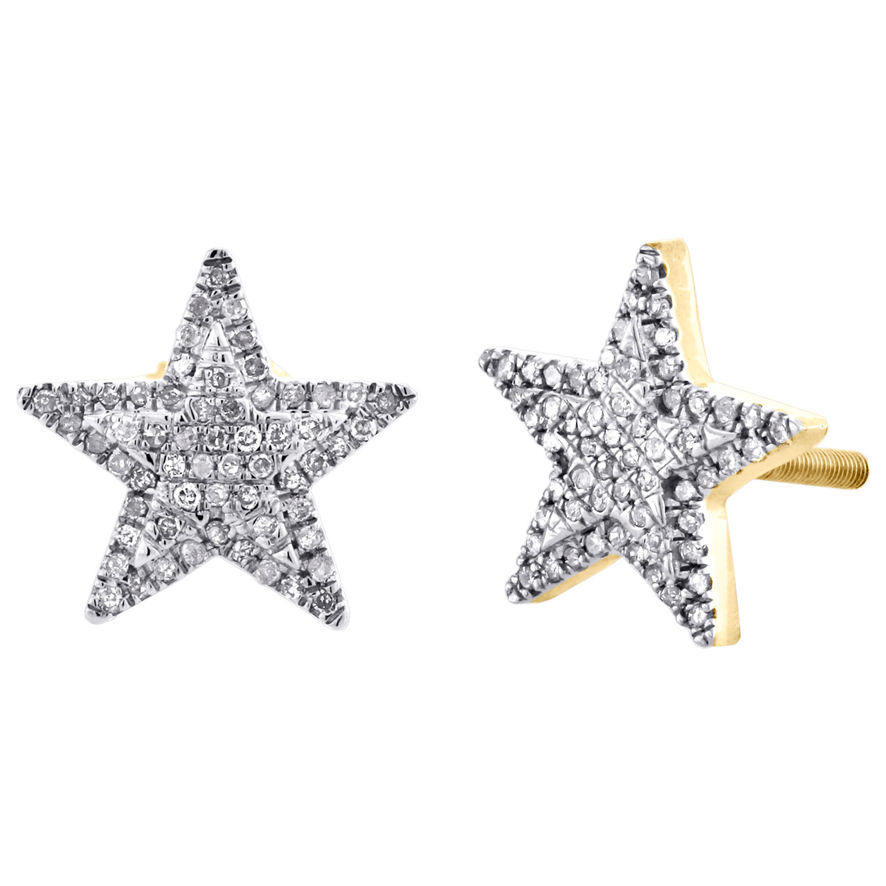 Stunning pair of studs added to Rodeo Jewelers diamond earring collection. These earrings are expertly crafted in Solid 10K Yellow Gold. Radiant with 1/4 ct. t.w. of Genuine White Round diamonds, these studs are high polished for a lustrous bright shine. These particular studs consist of round diamonds in pave setting, making the overall appearance larger and lustrous. Screw-backs for secure wear, these earrings will be a great addition to your jewelry collection. Star shaped frame give these pair of earrings depth and makes a bold fashion statement. Perfect size, these studs are 11mm in width and 2mm thickness.