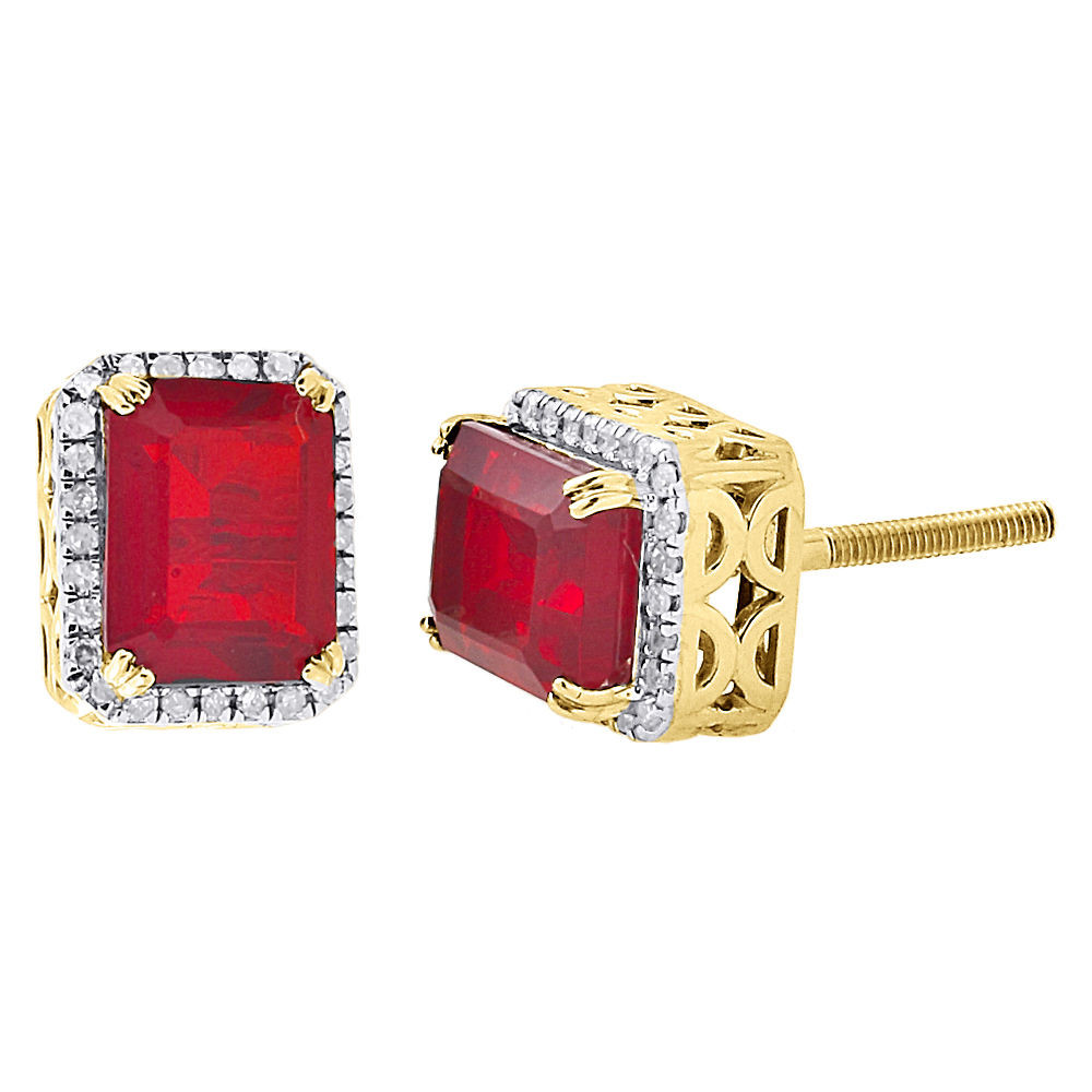New addition to our Rodeo Jewelers diamond studs collection. These particular earrings features a rectangle design. These earrings are set in real 10K Yellow Gold. The White Diamonds are set in Pave Setting forming a halo around the lab created Ruby Gemstone. All the diamonds are matching clarity & color. These makes for a great gift for any occasion. The center red stone is 8mm long & 6mm wide.