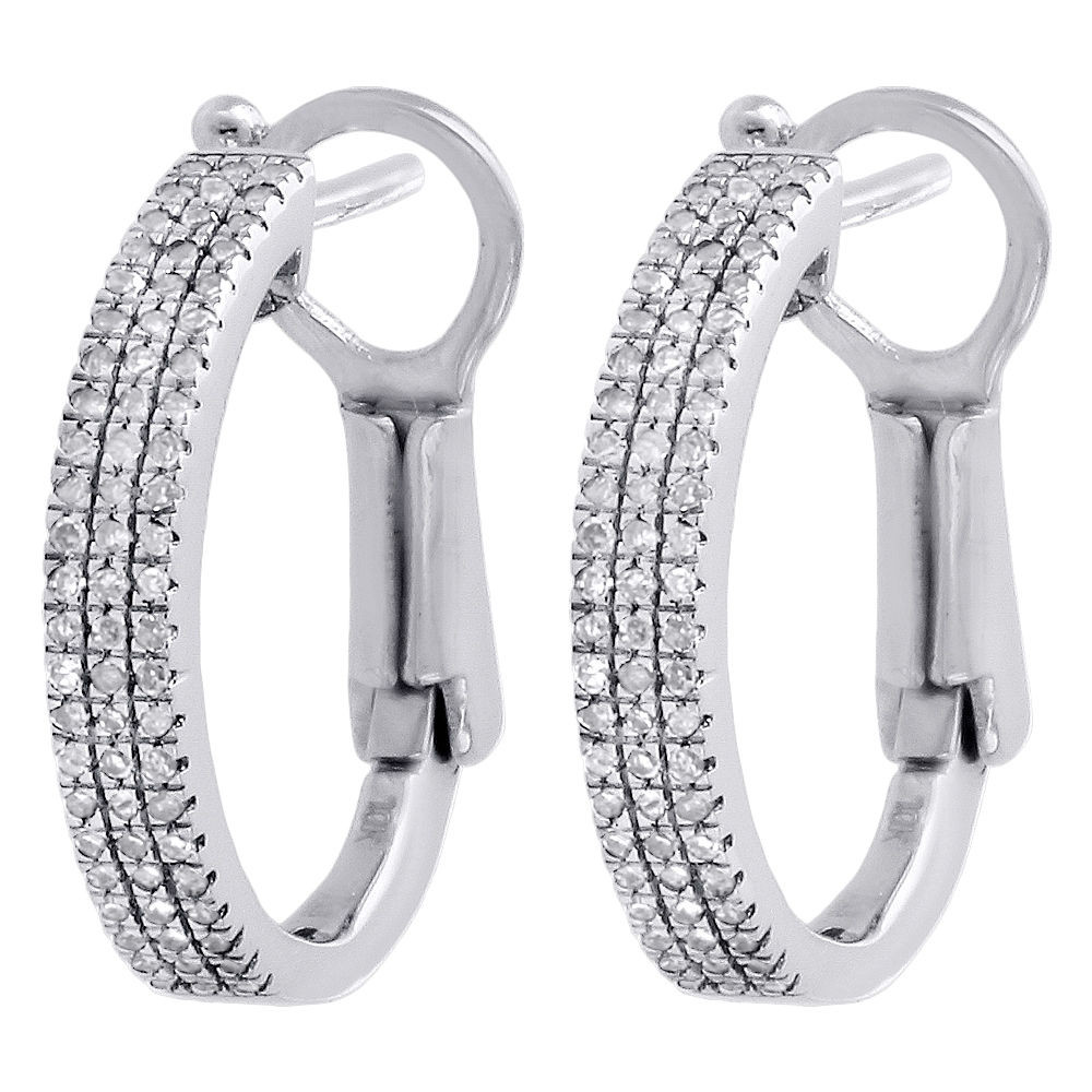 10K White Gold Genuine Round Diamond 3 Row Pave Hoop Huggie Earrings 0.23 Ct.