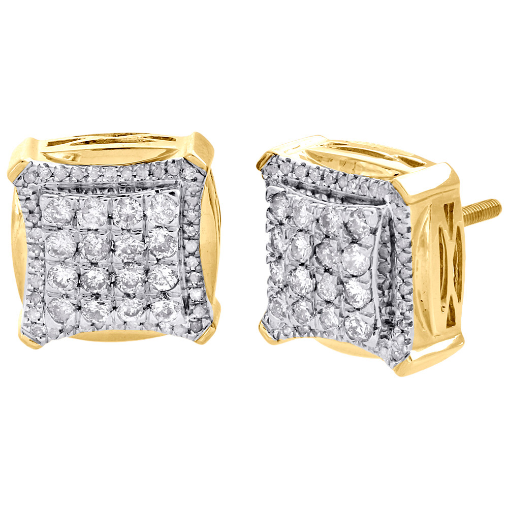 Stylish pair of square-shape cluster earrings are crafted in 10K yellow gold. Radiant with 0.46 ct. t.w. of diamonds. These particular studs consist of genuine round diamonds in pave setting, making the overall appearance larger and lustrous. The yellow gold metal is high polished to a bright shine. Perfect size studs for men's, these studs are 12.50mm wide & 6.75mm thick. Halo frame give these earring depth and makes a bold fashion statement. Screw-backs for secure wear, these fashion forward earrings will be great addition to your collection.