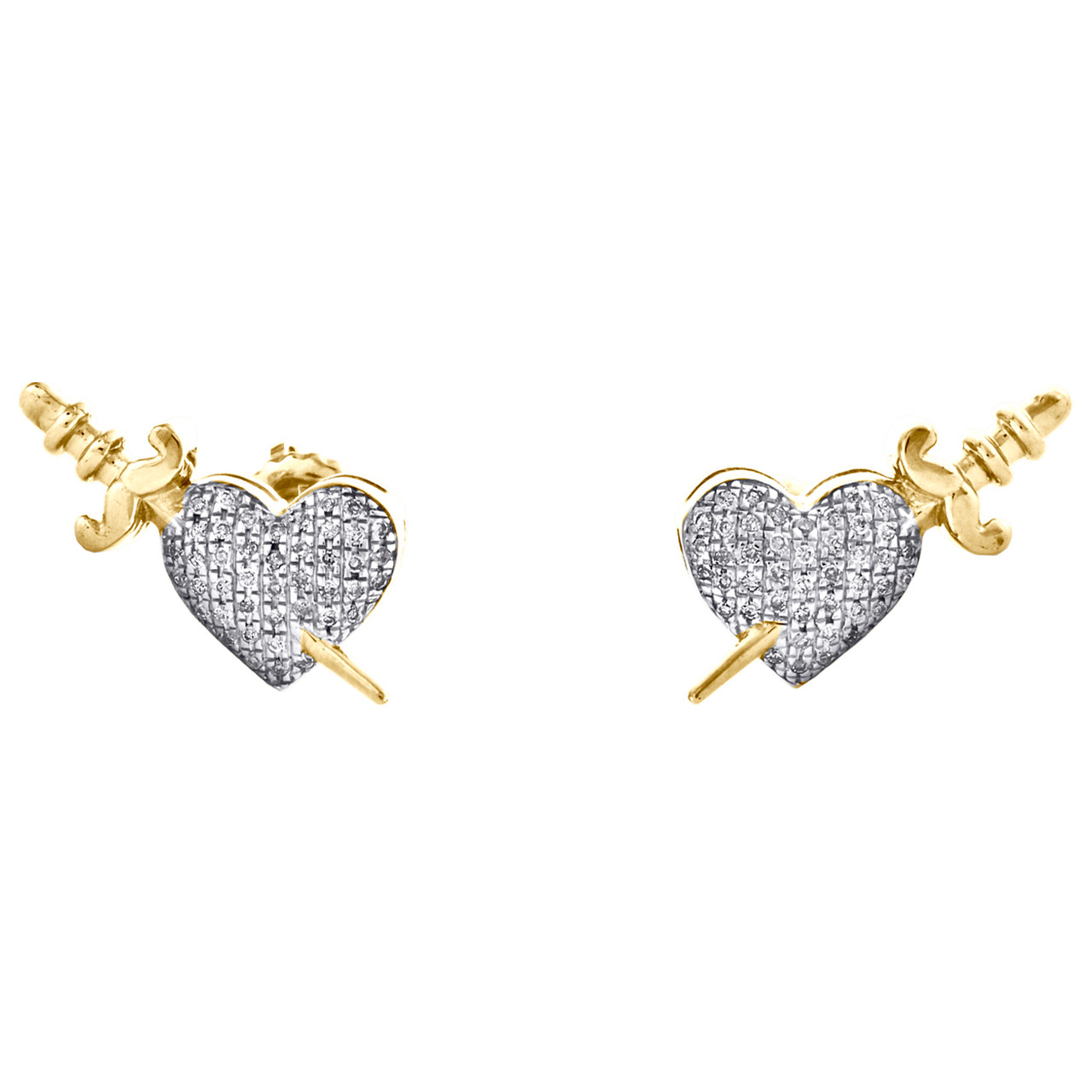 - 10K Yellow Gold Round Diamond Dagger Knife Heart Stud 16mm Pave Earrings 1/6 CT.