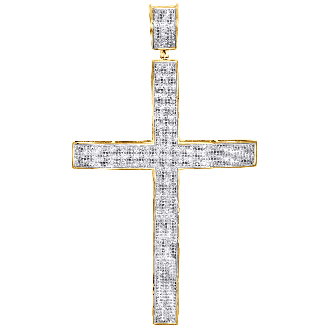 (17.2 gr. of 10K Yellow Gold | Total Carat Weight: 3 ct. t.w. of White Diamonds | Length: 4" (including bail) | Width: 2.25" | Clarity: I1 - I2 | Color: H - I | Men's Genuine Round Cut Diamond Domed Large Cross Pendant Statement Pave Charm)