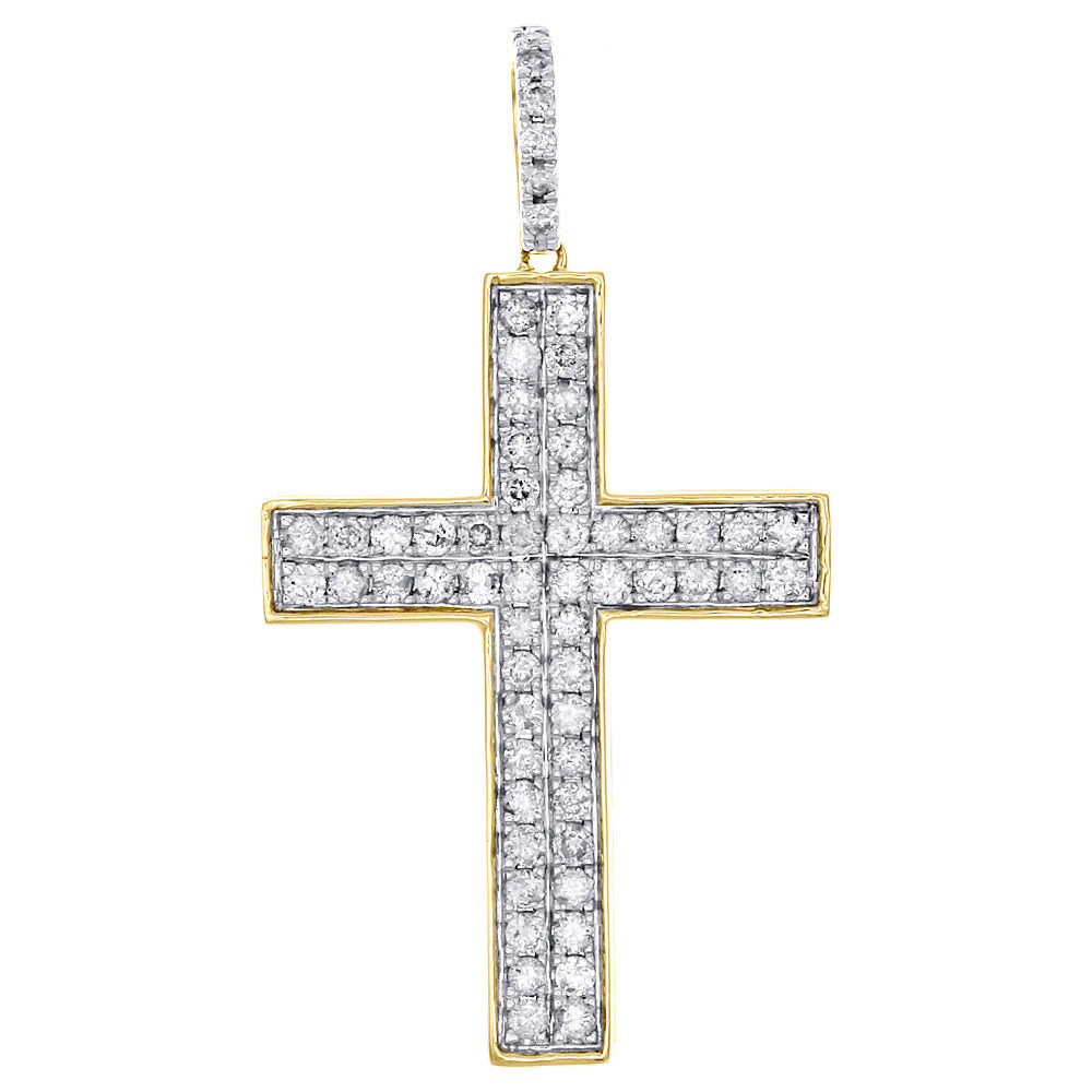 10K Yellow Gold Real Diamond Cross Pendant 1.65" Mens Two Row Pave Charm 1.06 Ct