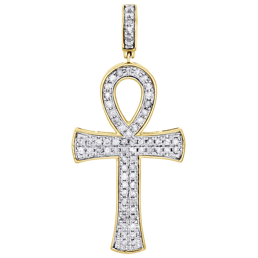 10K Yellow Gold Round Diamond Egyptian Ankh Cross Pendant 2" Pave Charm 1.02 CT.