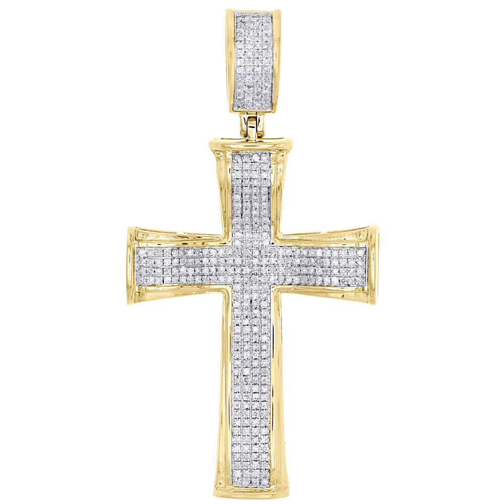 10K Yellow Gold Real Diamond Concave Cross Pendant 1.95" Mens Pave Charm 0.51 CT