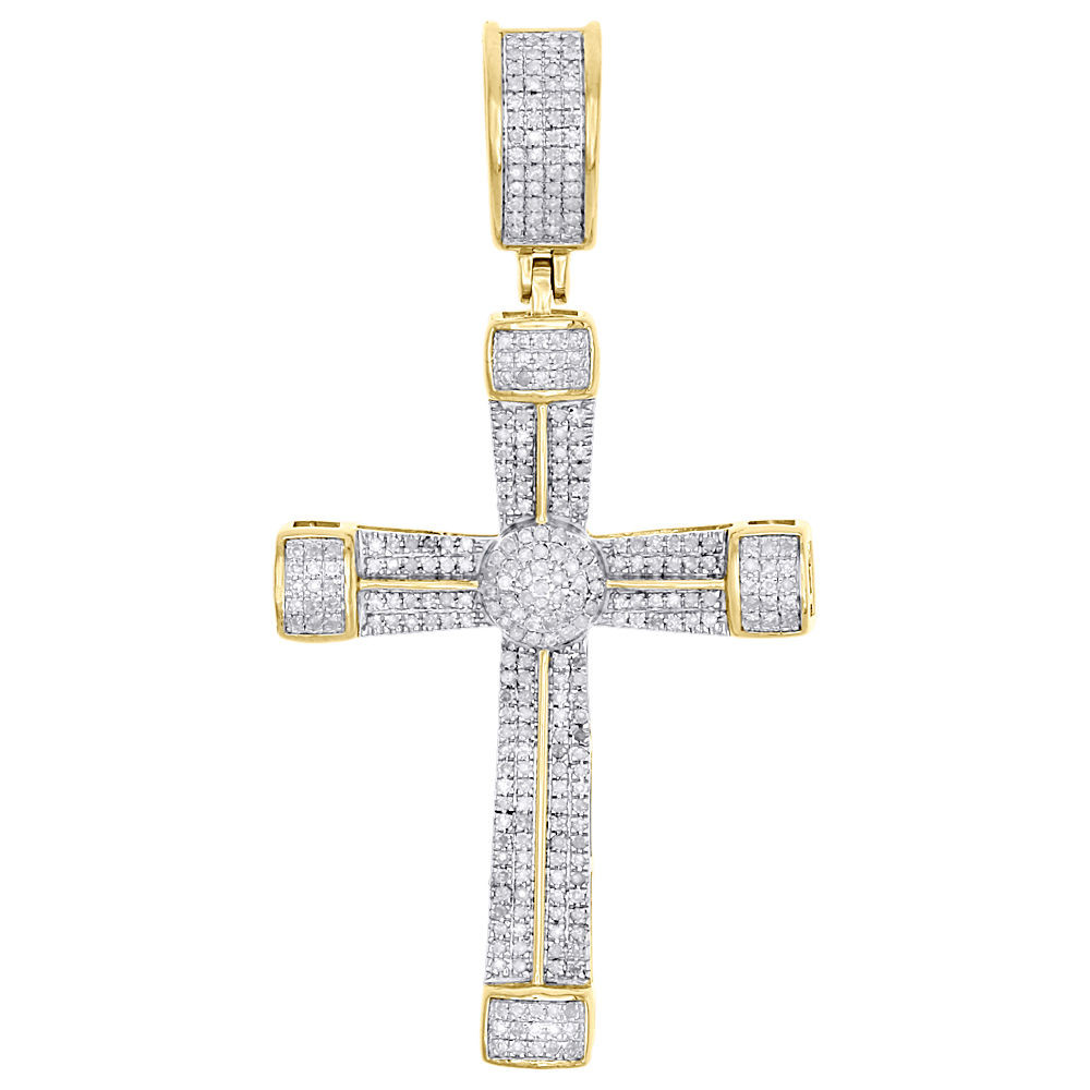 - 10K Yellow Gold Diamond Cross Designer Pendant 1.90" Men's Pave Charm 0.42 CT.