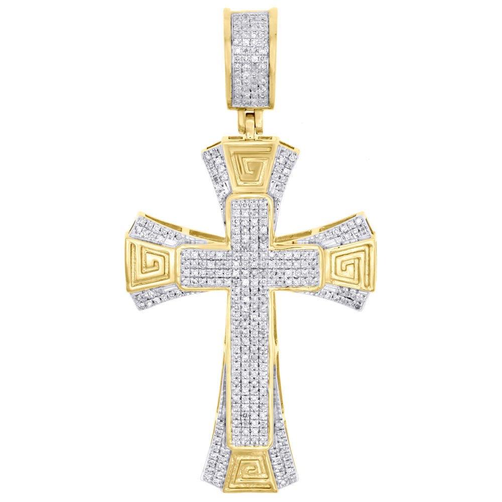 This eye-catching round diamond Religious Designer Greek Key Double Frame Raised Cross pendant is presented in real 10K yellow gold & shimmering white diamonds, ensuring sparkle from every angle. Radiant with 0.51 ct. t.w. of genuine diamonds, this pendant is buffed to a polished luster. This pendant has well built frame for durability. The diamonds are securely held between the gold mounting in a pave setting with prongs, making the overall appearance larger and lustrous. Matching pave diamond bale to complete the custom look. The bail of this pendant will fit up-to 7mm wide chain. This exclusive double frame dome cross pendant makes a bold fashion statement. These are all 100% genuine brilliant round diamonds. All the diamonds are matching throughout. Great size Men's pendant. This pendant is 6 grams and 2" long.