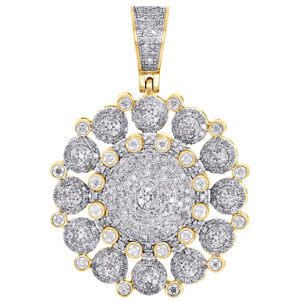 (6.2 gr. of 10K Yellow Gold | Total Carat Weight: 1.27 ct. t.w. of White Diamonds | Length: 1.50" (including bail) | Width: 1.05" | Clarity: SI2 - I1 | Color: H - I | Men's Real Genuine Diamond Statement Medallion Cluster Frame Pendant Pave Charm)