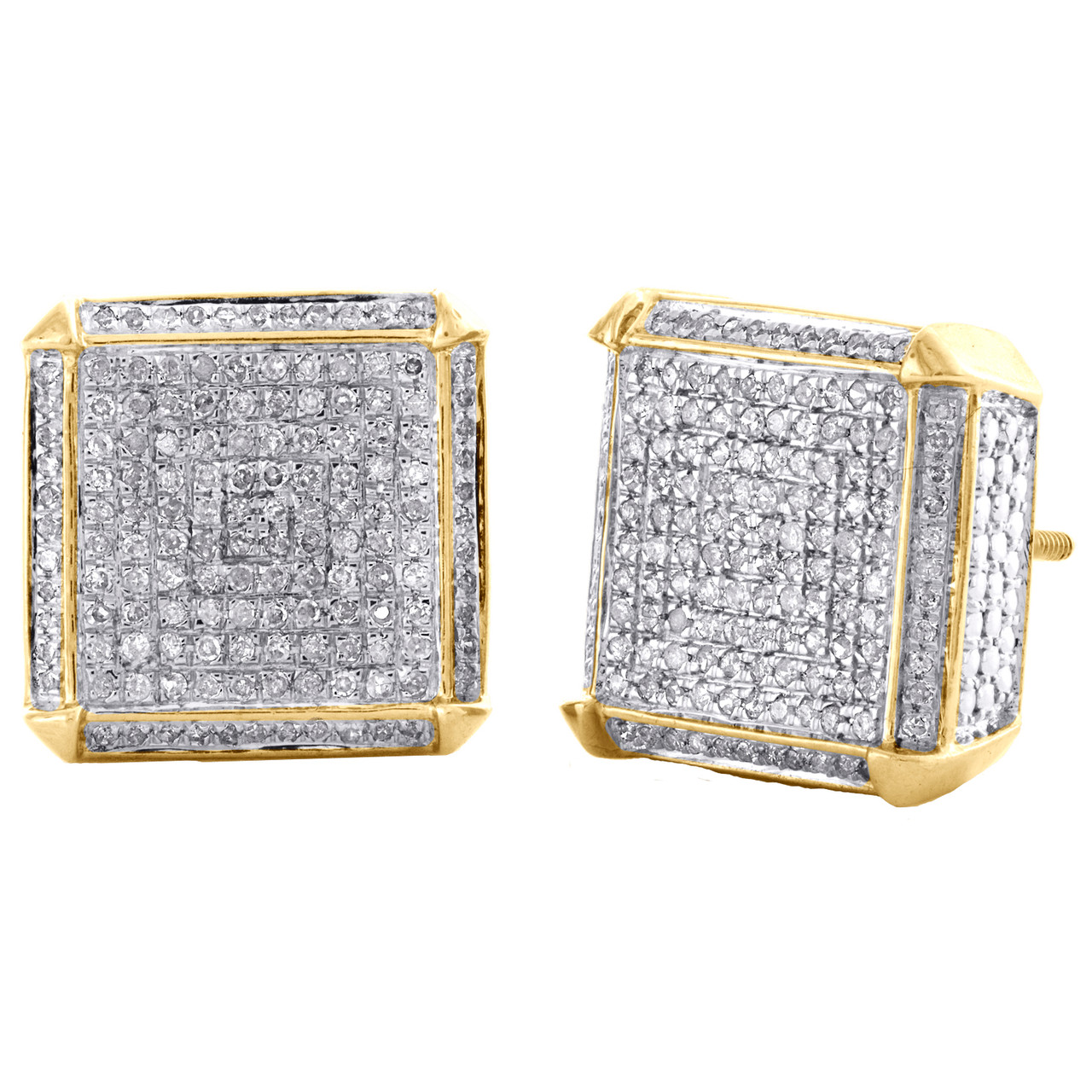 (7.2 gr. of 10K Yellow Gold | Total Carat Weight: 0.68 ct. t.w. of White Diamonds | Width: 13.75mm | Clarity: I1 - I2 | Color: H - I | Men's Genuine Round Diamond 3D Square Shape Frame Statement Studs Pave Earrings)